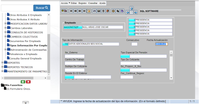 Todos estos campos se utilizan para el reporte de la planilla de aportes a seguridad social en el evento que aplique. (Se da prioridad al dato capturado en el campo, de lo contrario el sistema trae el valor por defecto para el empleado) Solo en el caso de Ibc_externo e Ibc_proporc_x_soc se tiene en cuenta este valor para el cálculo del IBC del empleado. En el caso del Tipo especial de pensión se afecta la tarifa a cargo del empleador