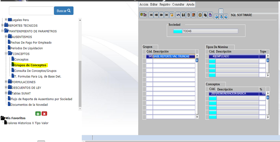 Queryx7® à Liquidación de Planilla à Mantenimiento de Parámetros à Conceptos à Grupo de Conceptos.