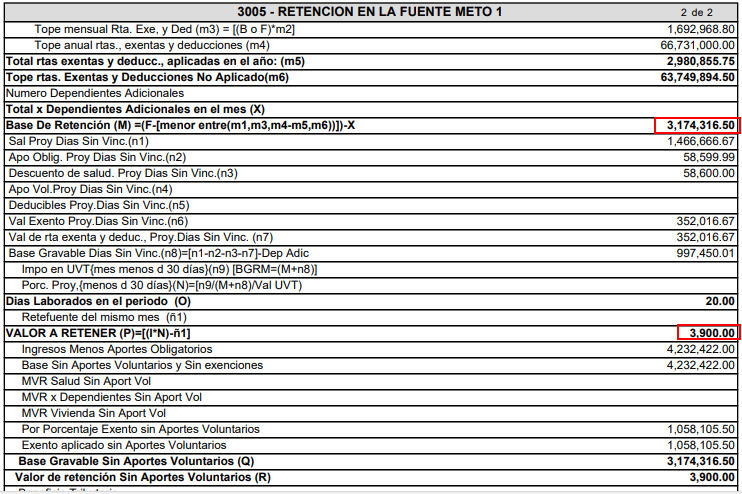 Para el cálculo de la retención en la fuente, cuando el empleado labora menos de 30 días en el mes, el sistema hace la aproximación al mes, esto porque la retención en la fuente se calcula con base a salario mensual. Para un empleado que laboró 20 días, el cálculo es el siguiente: