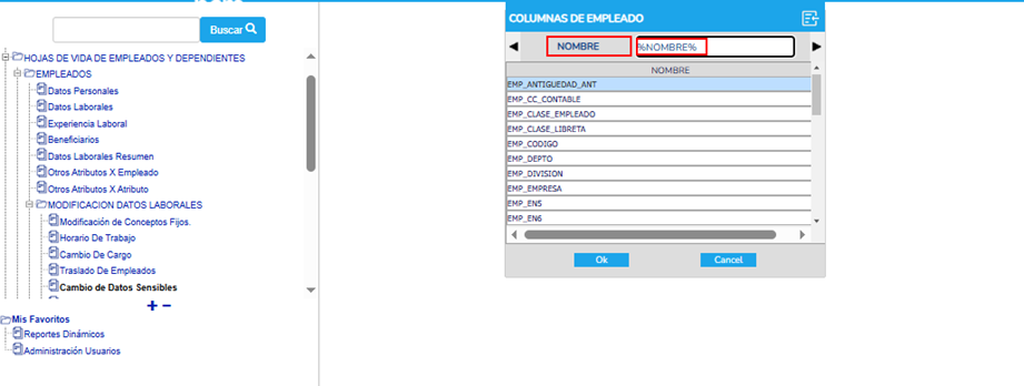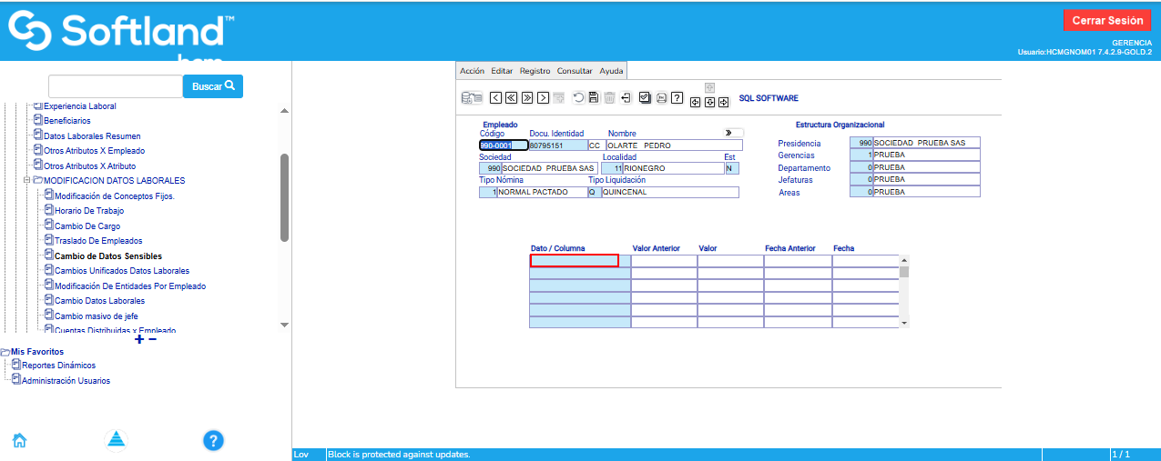 Al ingresar a cambio de datos sensibles, se consulta el empleado cuyo nombre se va a modificar. Luego se da doble clic en el campo "Dato/columna" y en el campo "Nombre", se ingresa, entre signos de porcentaje (%), la palabra clave correspondiente al campo que se desea corregir. Posteriormente se presiona Enter.