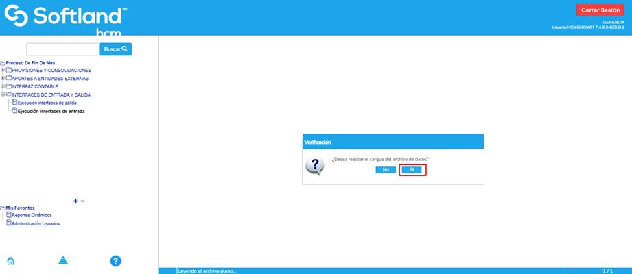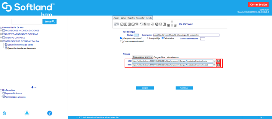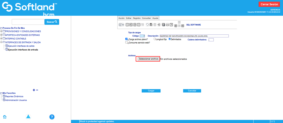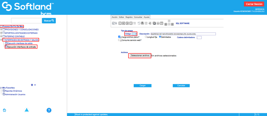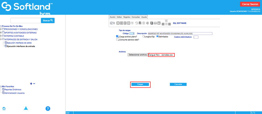 Para cargar novedades ocasionales mediante un archivo plano, se debe acceder a la siguiente ruta: Proceso de fin de mes\Interfaces de entrada y salida\Ejecución interfaces de entrada. En tipo de cargue se elige el "7 INGRESO DE NOVEDADES OCASIONALES (AUXILIOS)".