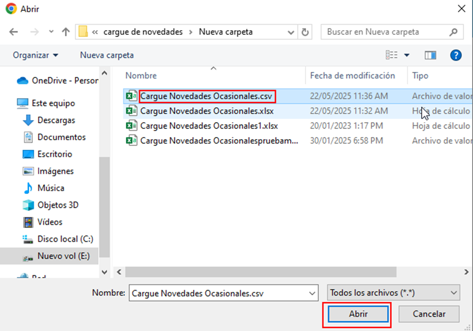 Luego se selecciona el archivo a cargar, que debe estar guardado como CSV delimitado por comas.