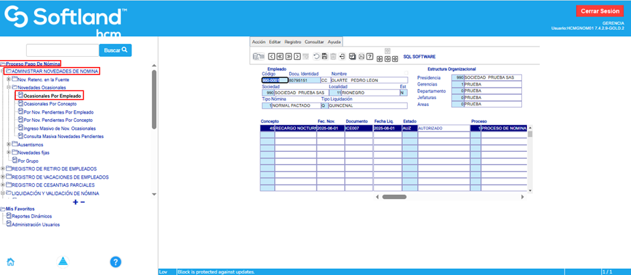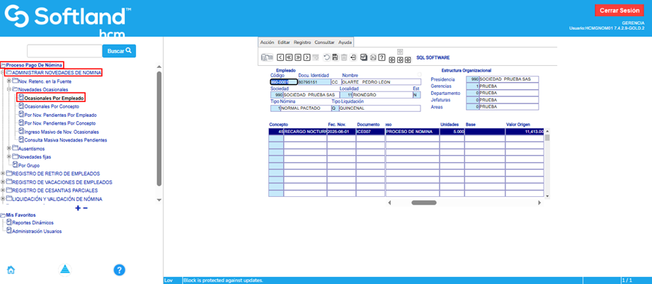 Al consultar en la novedad en Proceso de pago de nómina\Administrar novedades de nómina\Ocasionales por empleado, se valida que la novedad queda cargada.