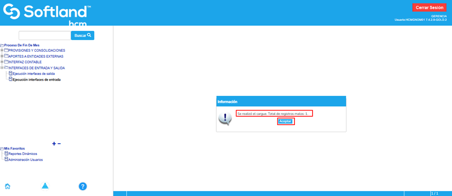 El sistema confirma que se ha cargado el archivo correctamente. El mensaje sobre el total de registros malos se debe a los encabezados del archivo. Para continuar, se da clic en el botón "Aceptar".