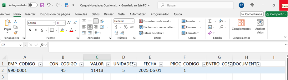 FECHA= Fecha de la novedad. Esta fecha debe quedar con formato AAAA-MM-DD PROC_CODIGO= Código del proceso para cargar las novedades. Normalmente va el proceso 1 que es el proceso de nómina.