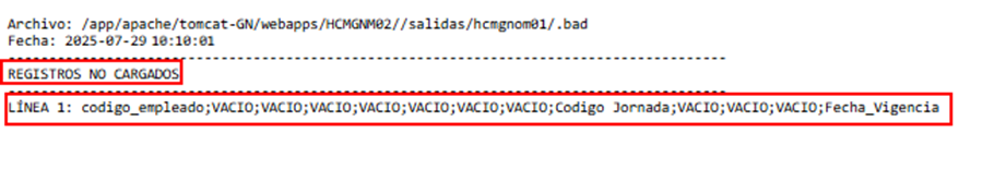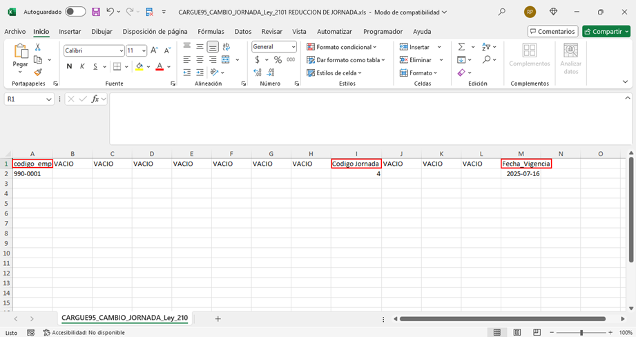 Los campos que deben llenarse son: código_empleado, Código Jornada y Fecha_Vigencia. Las columnas que indican “VACIO” no requieren diligenciamiento. Una vez que se haya completado la plantilla con la información de todos los empleados, se deben guardar los cambios.