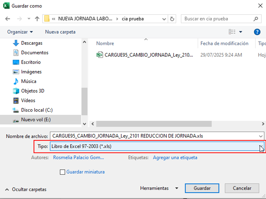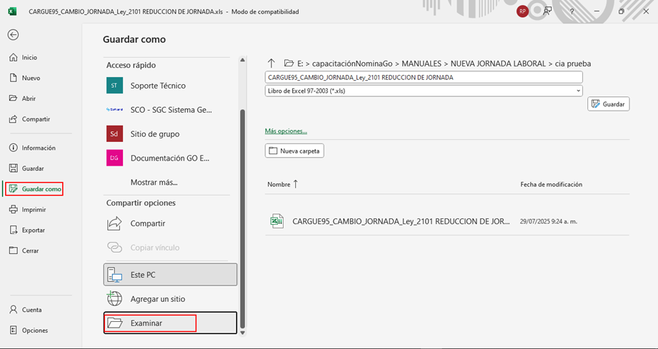 Luego, se debe guardar el archivo en formato .CSV. Para ello, selecciona la opción “Guardar como” y se elige la ruta donde se dese guardar el archivo.
