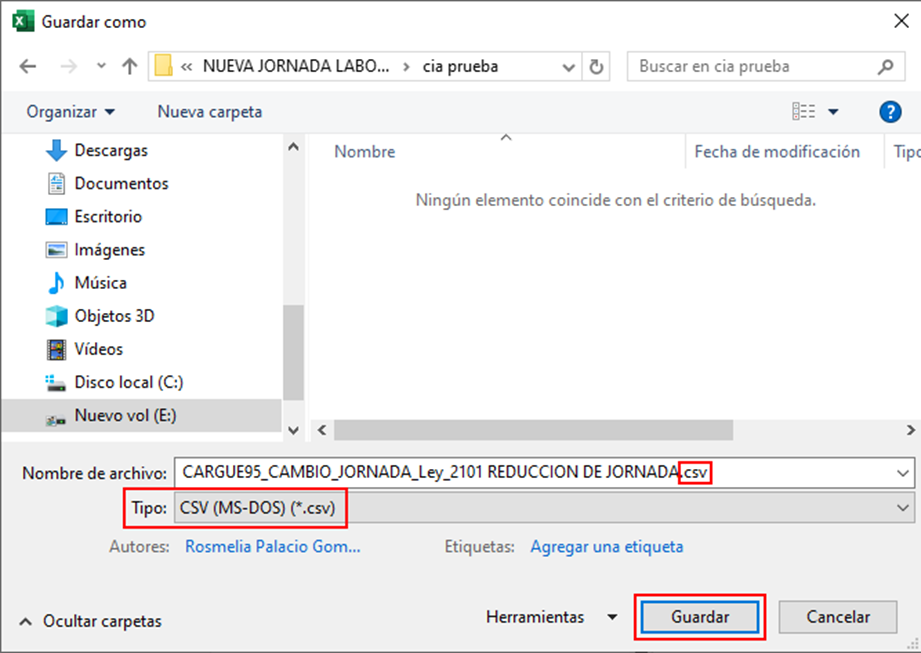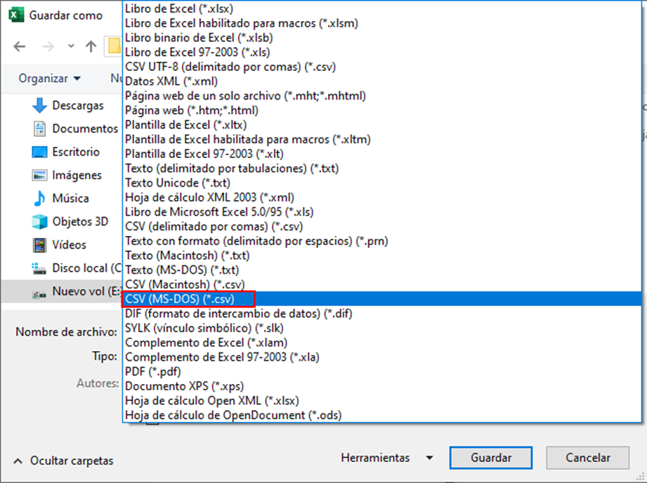 En tipo se selecciona CSV (MS-DOS) (*.csv)