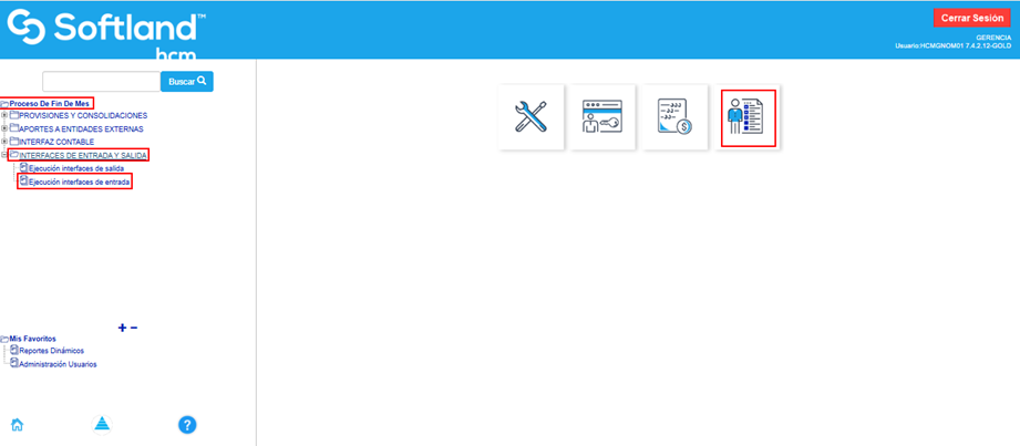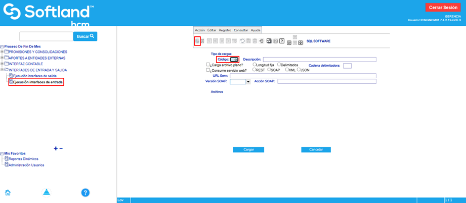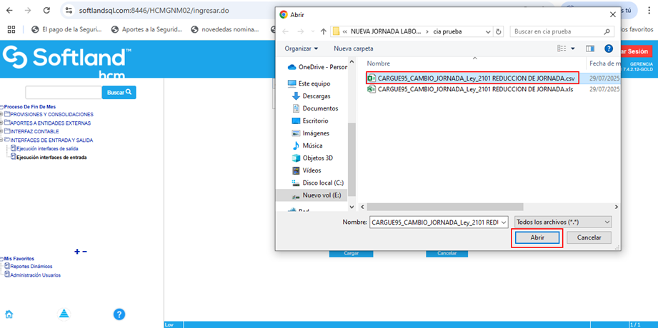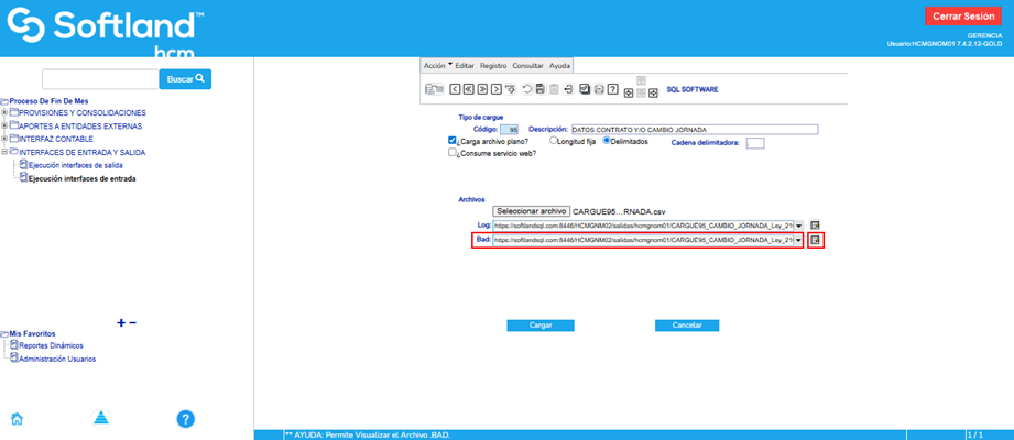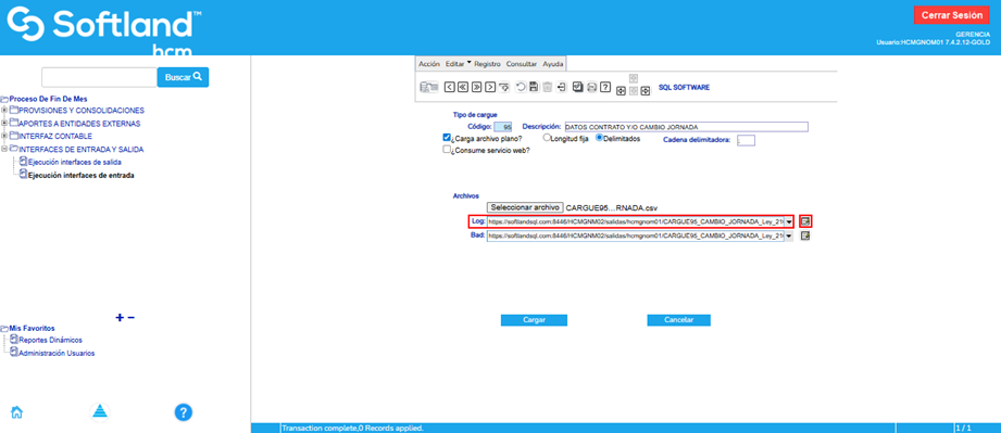 Se hace el cargue del archivo de cambio de jornada en la aplicación de nómina. Para ello se ingresa por la ruta: Proceso de Fin de Mes\Interfaces de entrada y salida\Ejecución de Interfaces de entrada.