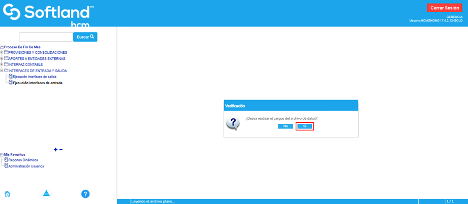 El sistema pregunta ¿Desea realizar el cargue del archivo de datos? Se selecciona el botón “Si”.