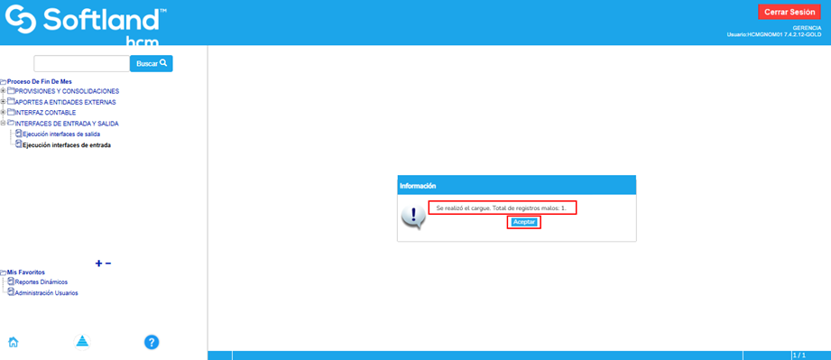 Luego, el sistema mostrará un mensaje indicando que el cargue se realizó y especificará el total de registros con errores. Es importante tener en cuenta que, en el mensaje, siempre aparecerá un registro malo, que corresponde a la fila que contiene los títulos de las columnas del archivo. En este mensaje se debe dar clic al botón “Aceptar”.