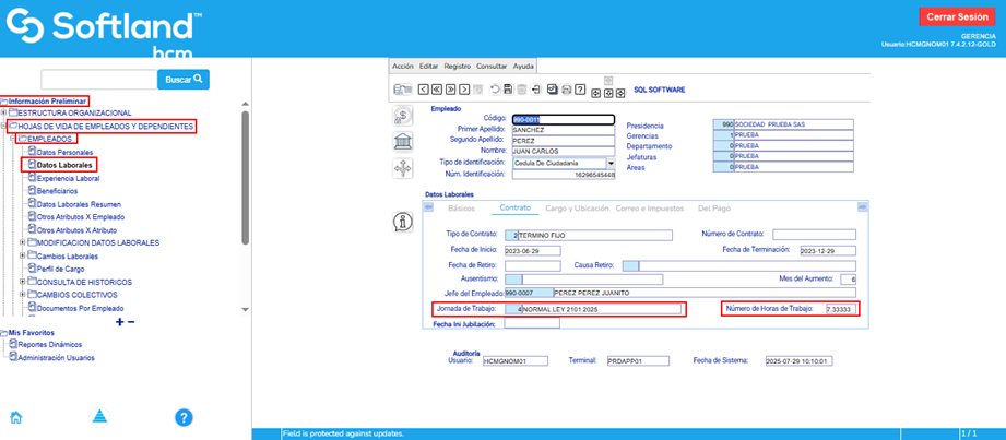 4. Finalmente se puede comprobar el cargue de la jornada de los empleados en los datos laborales del empleado, en la pestaña “Contrato”.
