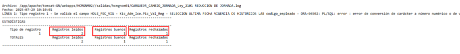 Se da clic en el botón que permite editar el log y se abre el reporte del log del proceso de cargue. Este reporte permite identificar el total de registros leídos, el total de registros buenos y el total de registros rechazados