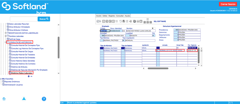 En la sección de información preliminar\Hoja de vida de empleados y dependientes\Empleados\Consulta de históricos\Histórico datos laborales, es posible verificar la asignación de la nueva jornada al empleado, junto con la fecha de vigencia.