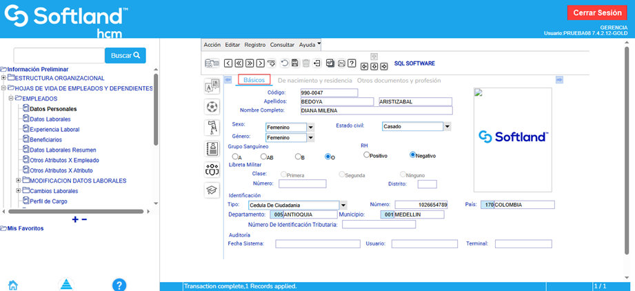 En la pestaña “Básicos”, no se ingresa el dato del campo “Código”. Después de diligenciar toda la información de datos personales y grabar, el sistema asignará automáticamente el código del empleado.