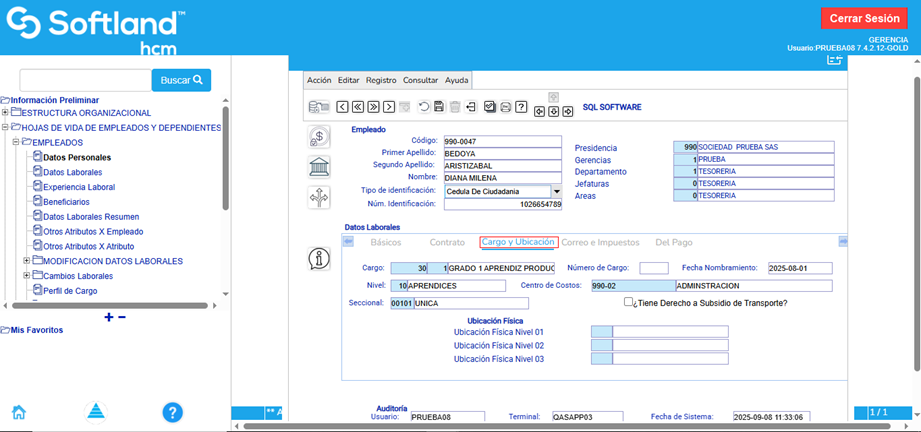En la pestaña “Cargo y Ubicación”, se diligencias todos los campos requeridos.