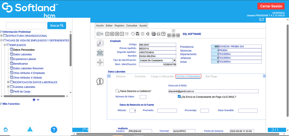 En la pestaña “Correo e impuestos” se diligencian el campo de “Dirección E-MAIL, se marca la opción para el envío de los comprobantes de pago por correo electrónico, en caso de querer hacer el envío de estos comprobantes vía E-Mail y se indica el método de retención en la fuente que puede ser 1 artículo 385 o 2 artículo 386 porcentaje fijo.