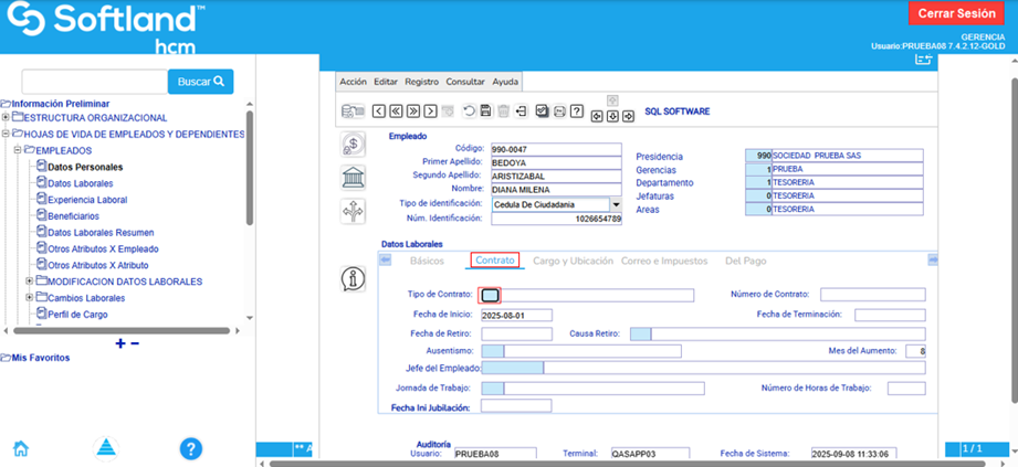 2. Después de grabar los datos personales se da clic en el botón “Datos laborales” y se procede a diligenciar la información de la pestaña “Básicos”.