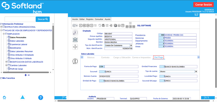 En la pestaña “Del pago” se registran los datos de la entidad bancaria de la empresa y de la entidad bancaria receptora de la nómina del empleado, incluyendo su número de cuenta.