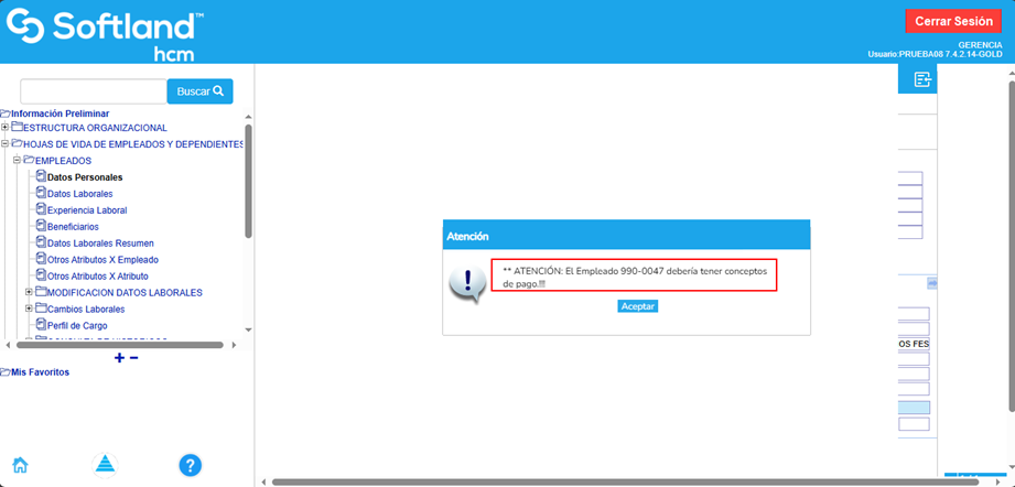 Después de ingresar todos los datos laborales, se da clic al botón guardar. El sistema arroja un mensaje de advertencia que indica que el empleado debería tener los conceptos fijos de pago.