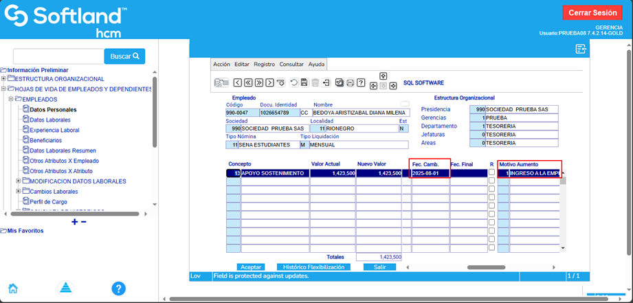 También se debe ingresar la fecha de cambio de salario (El sistema normalmente trae la misma fecha de ingreso) y se selecciona el “Motivo Aumento”.