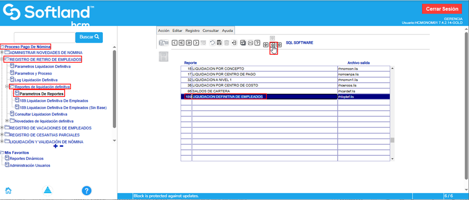 Para revisar la liquidación definitiva, se parametriza el reporte 189 Liquidación definitiva, desde la ruta: Proceso pago de nómina\Registro de retiro de empleados\Reportes de liquidación definitiva\Parámetros de reportes. Para ingresar los parámetros del reporte, se selecciona el reporte 189 Liquidación definitiva de empleados, se hace clic en el botón “Siguiente bloque”, se diligenciar los parámetros, se aceptan los cambios y se guarda la configuración.