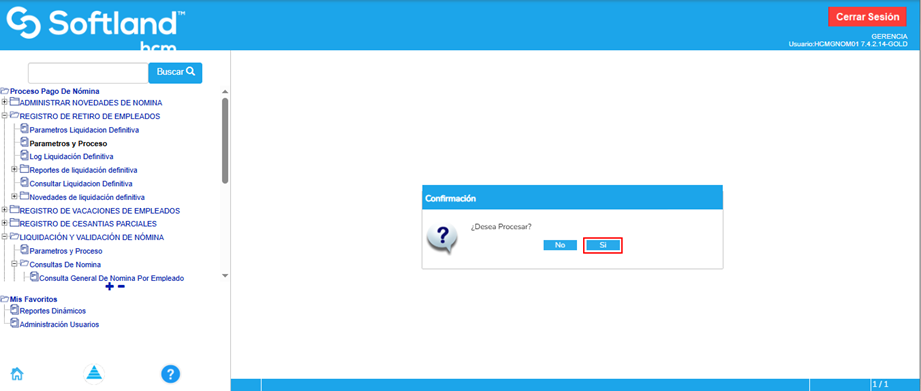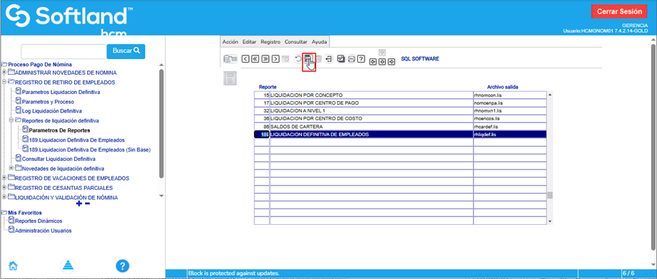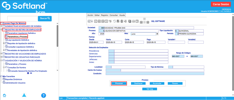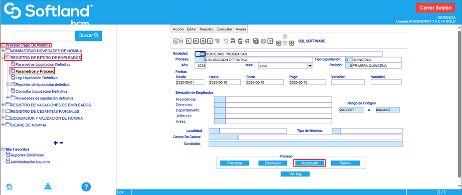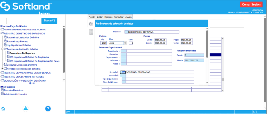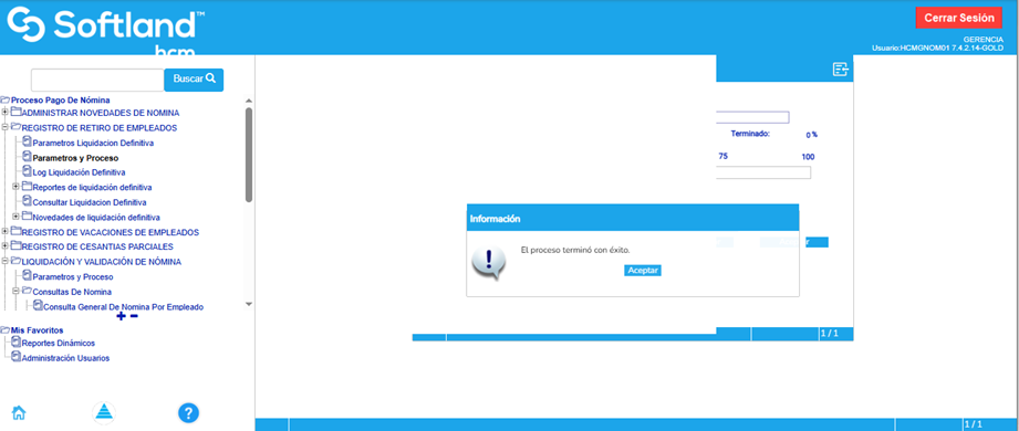 Finalmente, se verifica que el reporte esté correcto, se generan los informes necesarios y se procede a acumular el proceso 3 Liquidación definitiva, por la ruta: Proceso pago de nómina\Registro de retiro de empleados\Parámetros y procesos