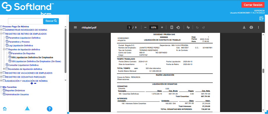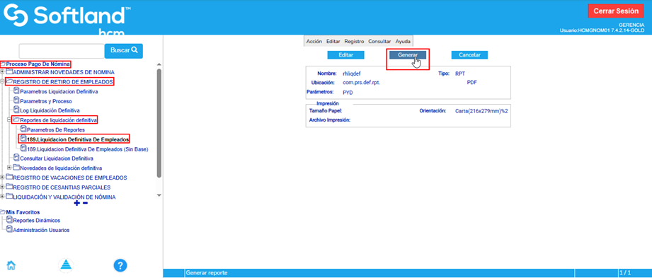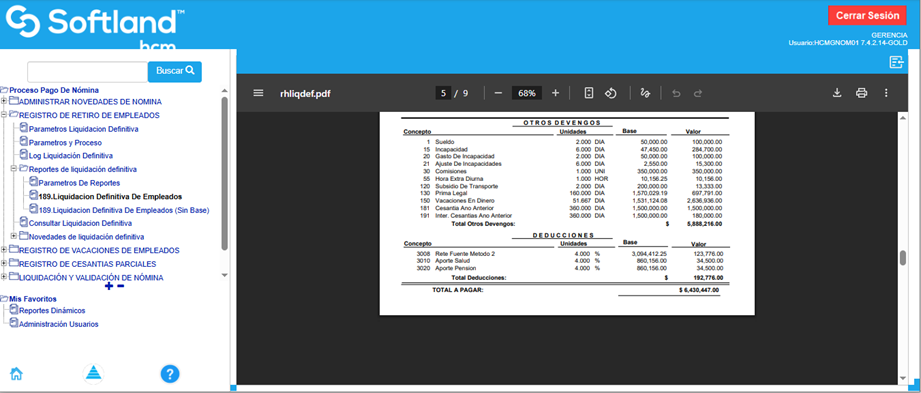 Luego de grabar los parámetros del reporte, se genera el reporte desde la ruta: Proceso pago de nómina\Registro de retiro de empleados\Reportes de liquidación definitiva\189. Liquidación definitiva de empleados.