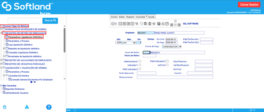 Para realizar el proceso de liquidación definitiva se debe ingresar por la ruta: Proceso pago de nómina\Registro de retiro de empleados\Parámetros liquidación definitiva. Allí se busca el empleado a retirar y se ingresan los parámetros de liquidación definitiva. Luego de ingresar los parámetros se graban los cambios.